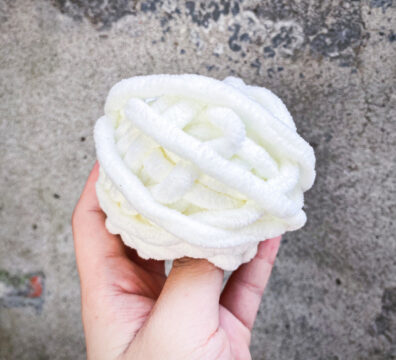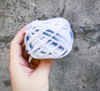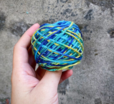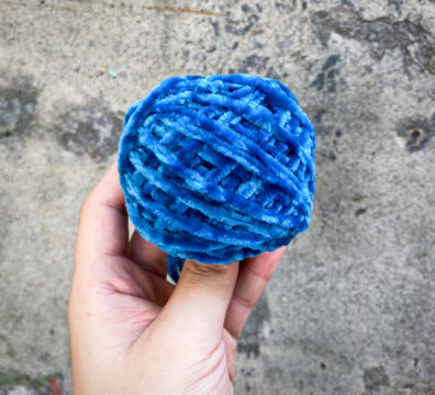 絨線(藍)、漸變色棉線(白灰)、鞋帶式毛線(黃)