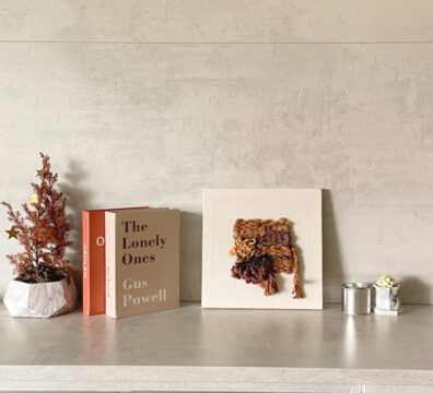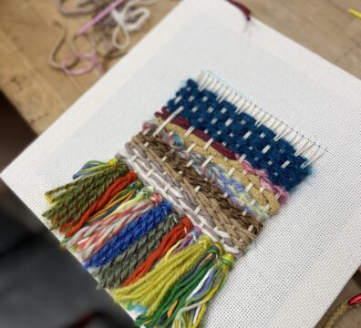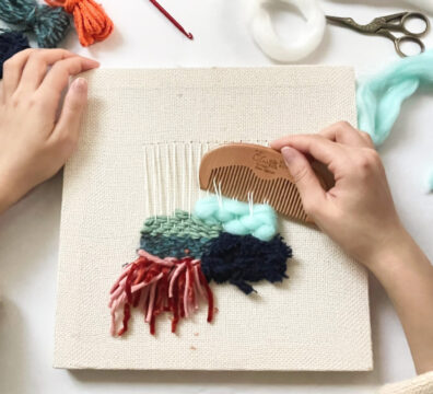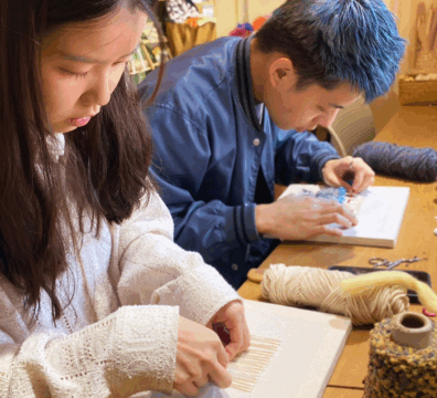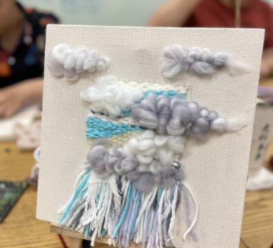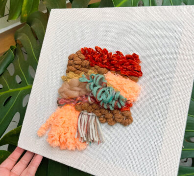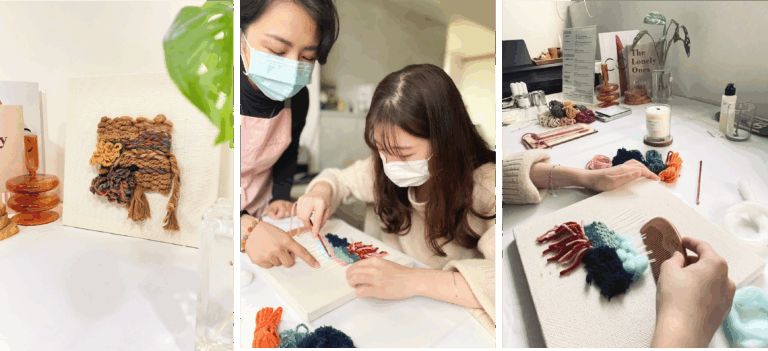 在布框上自由梭織,結合毛線、布料與回收素材,將傳統工藝轉化為現代美感。